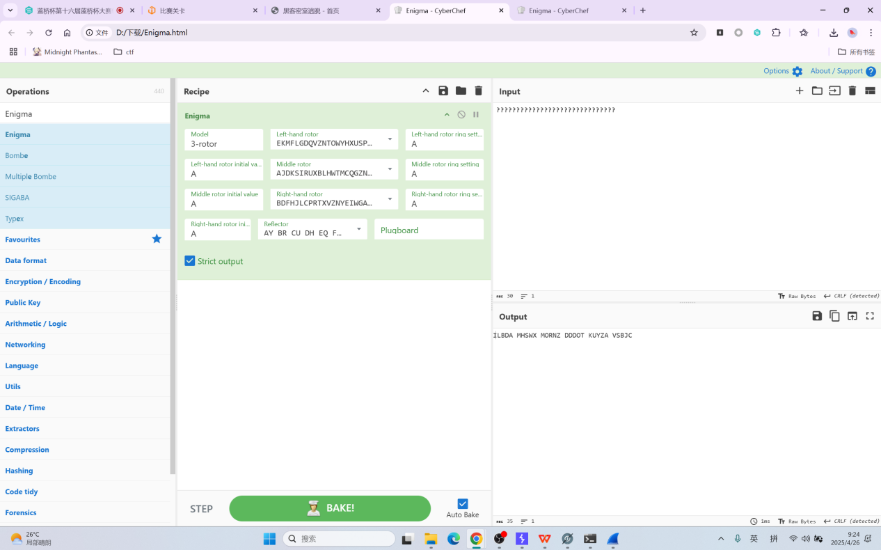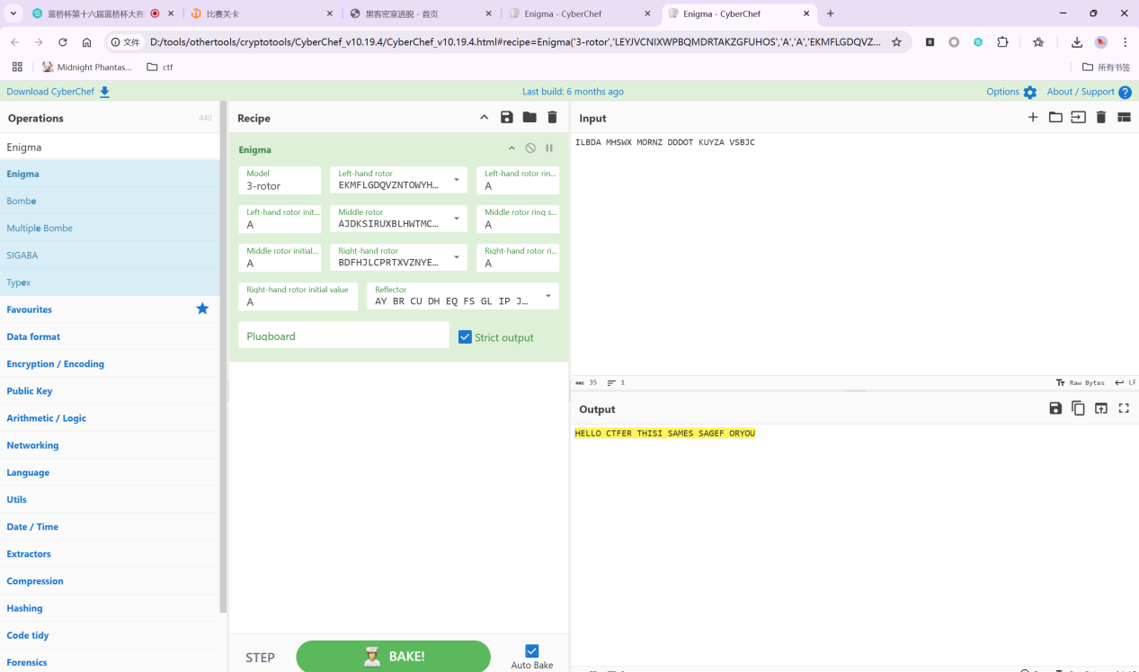 所以我们反过来,打开CyberChef,选择Enigma,把刚才题目的密文复制进去,得到的是可读的字符串,flag包裹一下去除空格就可以了