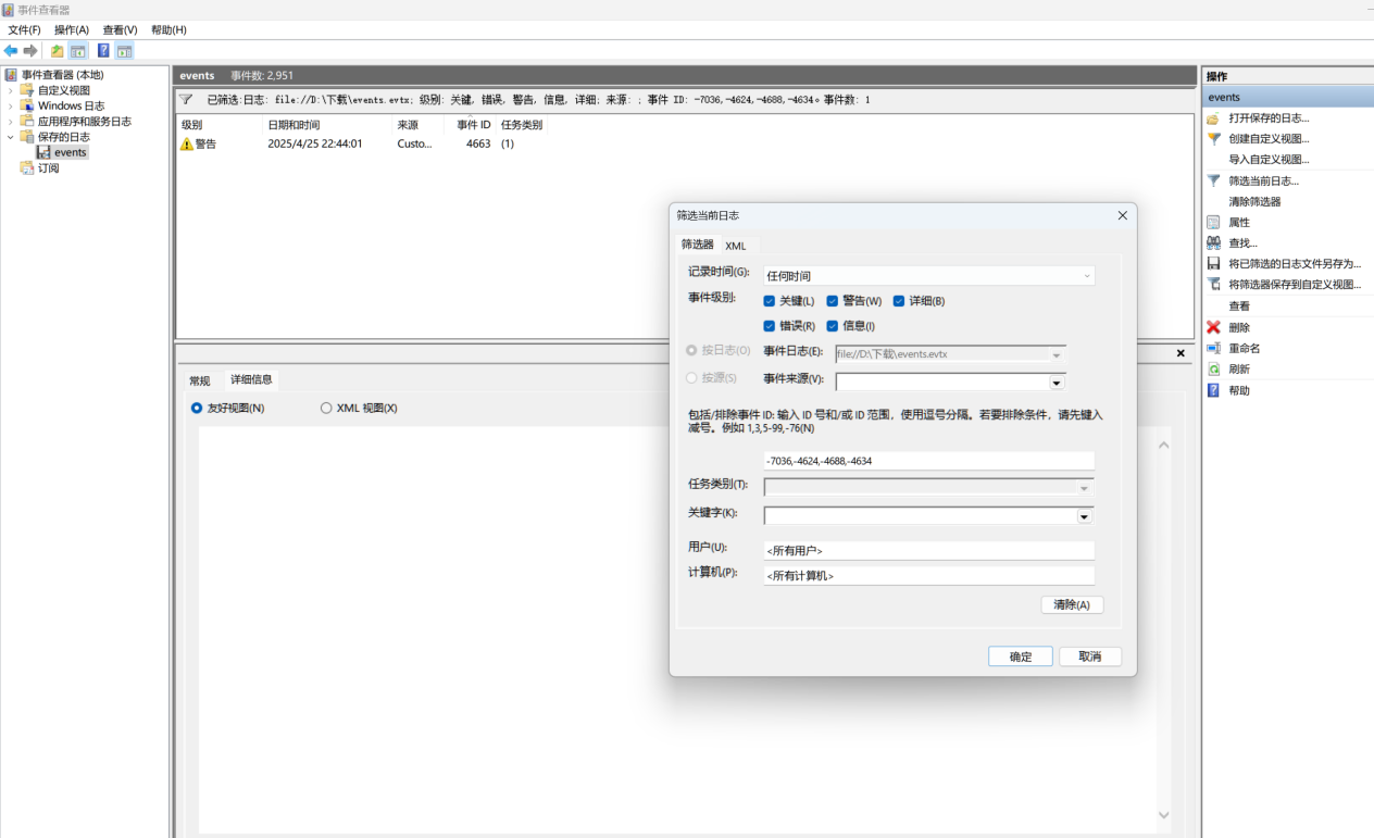 右上角筛选,把几个事件级别都勾选上,然后把这几个-7036,-4624,-4688,-4634,填上去注意要加负号代表剔除,然后就发现只有一个