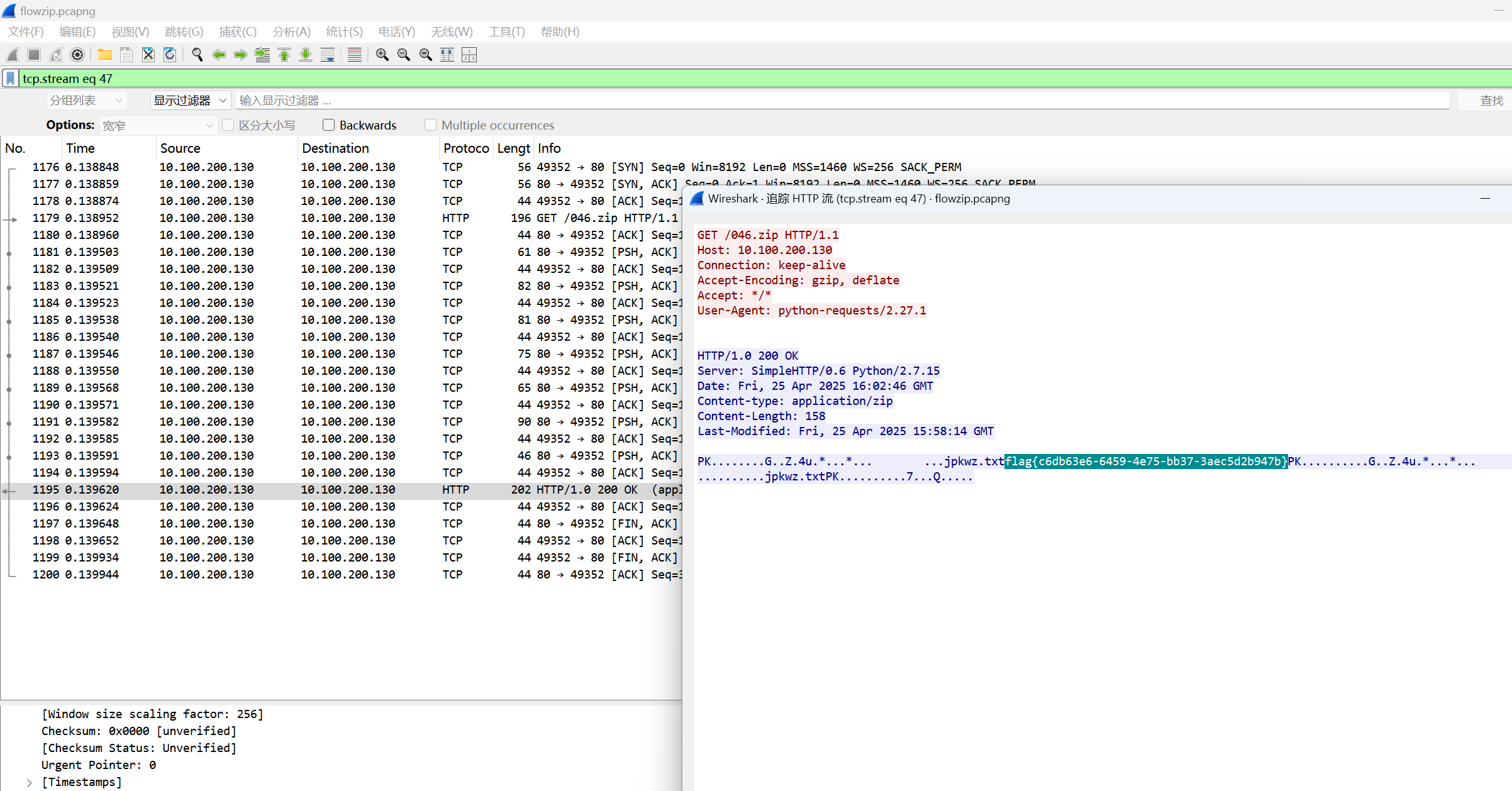 这一题真的有点废时间,我一开始从头看到尾都没有结果,甚至随便找了给压缩包就尝试解压,发现不行,有看一下这个是个比较简单的题目,应该直接找就行了,观察length不同的就行了,真的需要耐心。结果是202的不一样,位置在第46个压缩包,其他的都是196和260等干扰选项。然后用追踪流http打开这个就行了