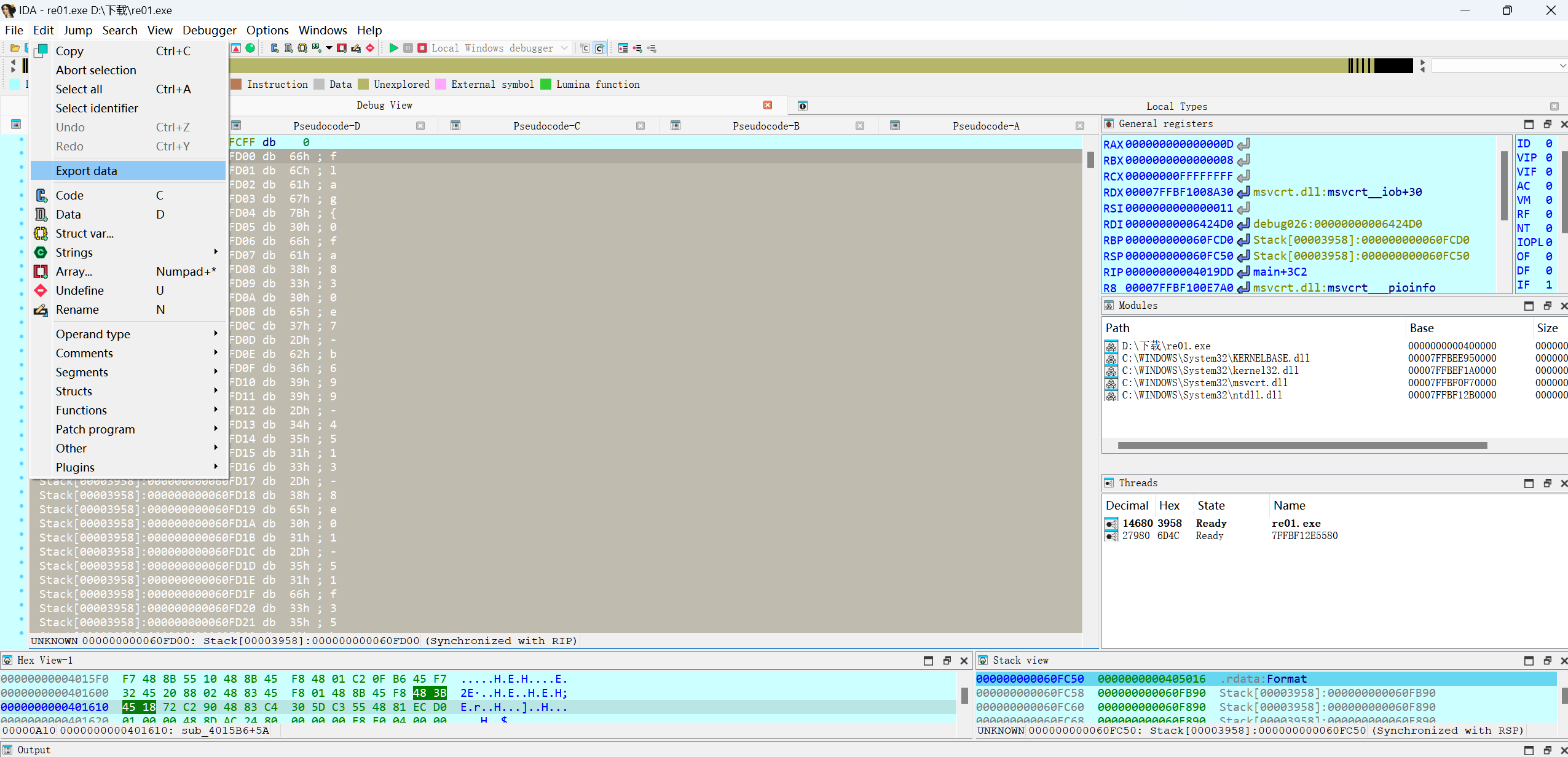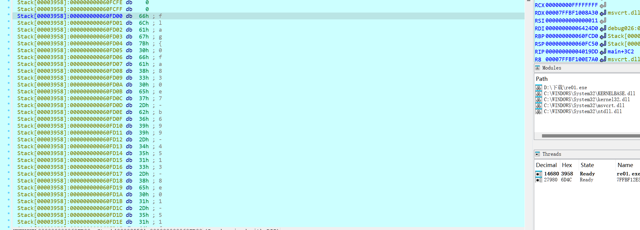 这道re题动态调试一下直接出来了也没有什么反调试函数,真的很简单。动态调试有个很好的作用,直接可以绕过繁琐的加密函数和头大的字符,直接看到结果,这样我们就不用对前面的繁琐的加密代码进行分析了